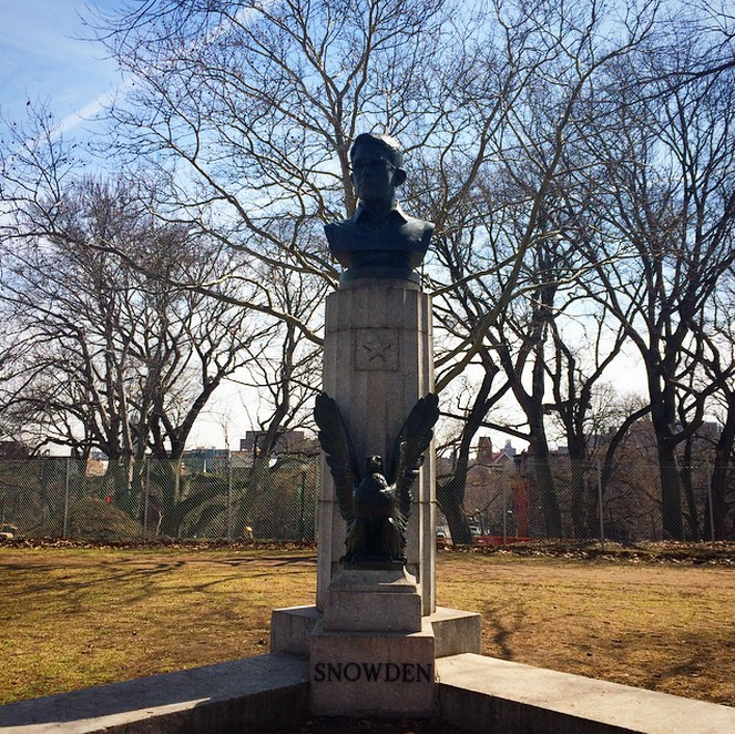 The bust of Snowden on top of a pedestal ... in the park...